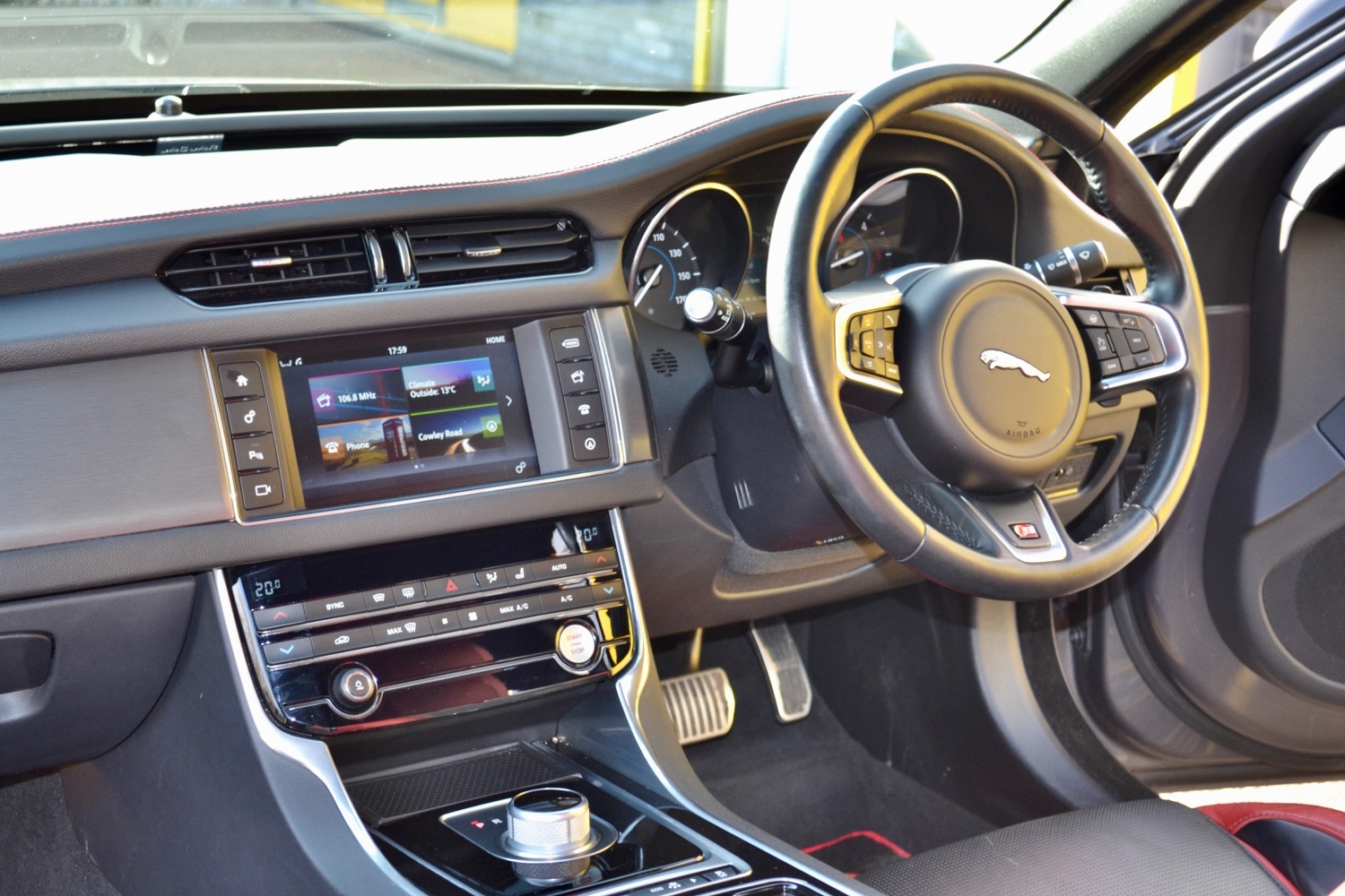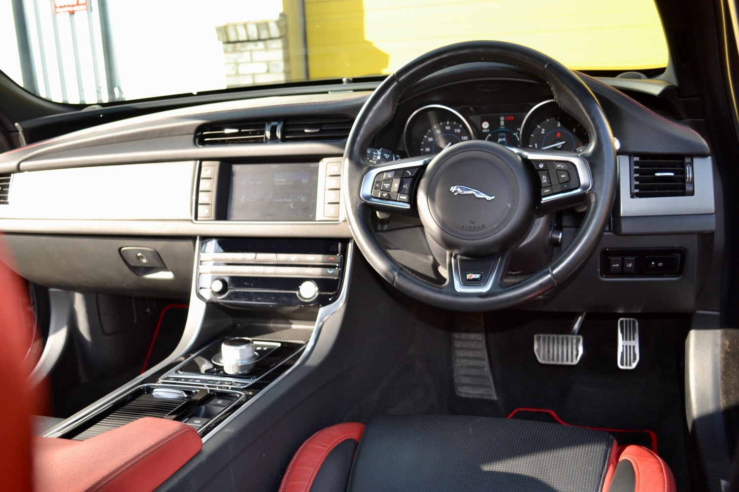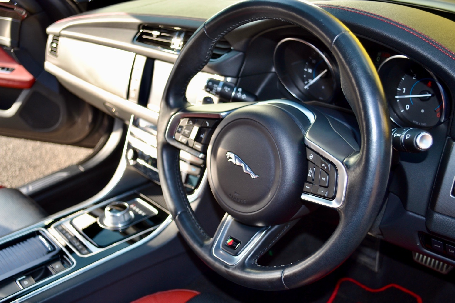 19in Alloy Wheels - Razor 7 Twin-Spoke with Silver Finish, 8in Capacitive Touchscreen, AEB - Autonomous Emergency Braking, Acoustic Layer Windshield, Adaptive Dynamics, Bluetooth Telephone Connectivity, Cruise Control with Adaptive Speed Limiter, DAB Radio + and DMB, Door Mirrors - Power Folding with Auto-dimming-Puddle Light and Clear Side Turn Indicators, Dynamic Volume Control, Front Parking Aid, Headlights - Bi-Function HID Xenon with LED Daytime Running Lights, Heated Front Seats, Heated Front Windscreen, InControl Apps, InControl Touch Navigation - SD, Interactive Voice Control, Jaguar Smart Key System with Keyless Entry, Jaguar Smart Key System with Keyless Start, Lane Departure Warning, Meridian Audio System, Rear Parking Aid, Rear View Camera, Seats - 10x10 Way Front Seats - Electric Adjustment, Seats - Driver Memory, Seats - Sports, Torque Vectoring by Braking - TVBB, Traffic Sign Recognition with Intelligent Speed Limiter, 1x USB Socket, 2-Zone Climate Control, AM-FM Radio, ASPC - All Surface Progress Control, Airbags - Front Side, Airbags - Passenger, Airbags - Side Curtain, Analogue Dials with 5in Full Colour TFT Display, Auto-Dimming Interior Rear View Mirror, Automatic Headlight On, Body Coloured Bootlid Mounted Spoiler, Bright Finish Stainless Steel Pedals, CBC - Cornering Brake Control, EBD - Electronic Brake-Force Distribution, EPB - Electronic Parking Brake - Drive Away Release, Electrochromic Rear Interior View Mirror, Front Seats - Whiplash Reduction System, Grey Figured Ebony Veneer, Headlight Power Wash, Headlining - Morzine - Jet, Heat Insulating Glass - Green All-round, Heated Washer Jets, InControl Protect, InControl Remote Premium for Warranty Period, LED Tail Lights, Leatherette Wrapped IP Topper, Perimeter Alarm, Rain Sensing Windscreen Wipers, Rear Valence - Gloss Black - S, Red Brake Calipers, Remote Control Central Locking, Seats - Lumbar Support - Driver-Passenger-4 Way Power, Side Sills - Gloss Black, Sill Finishers - Metal with Jaguar S Branding, Steering Column - Electric Adjustment for Height and Reach with Entry and Exit Tilt-Away, Steering Wheel - Softgrain Leather S Branded Sports Style, Subwoofer, Trac DSC - Dynamic Stability Control with 3 Setting Levels, Traction Control, Trailer Stability Control, Trunk Finisher - Satin Chrome, Twin Tailpipes, Tyre Pressure Monitoring System, Window Surrounds - Gloss Black Finish, iPod Integration