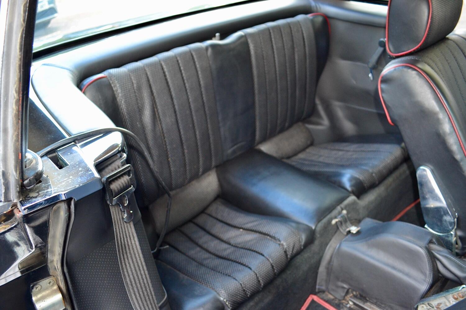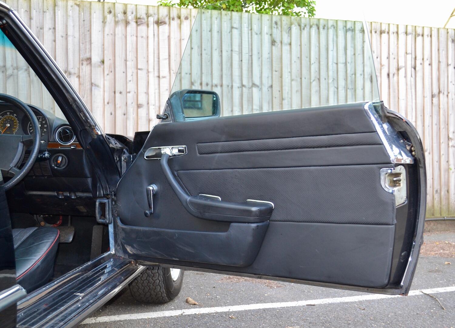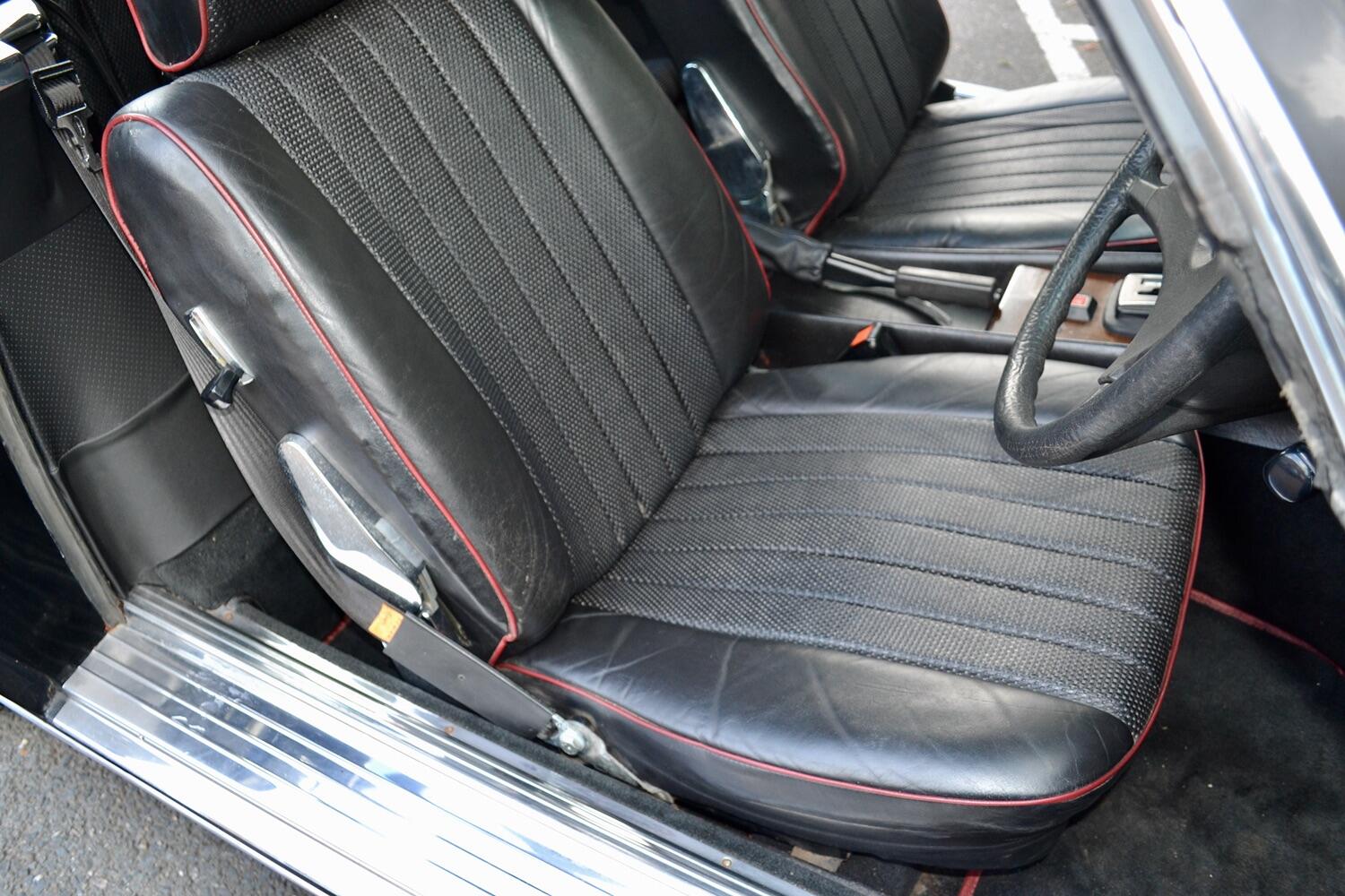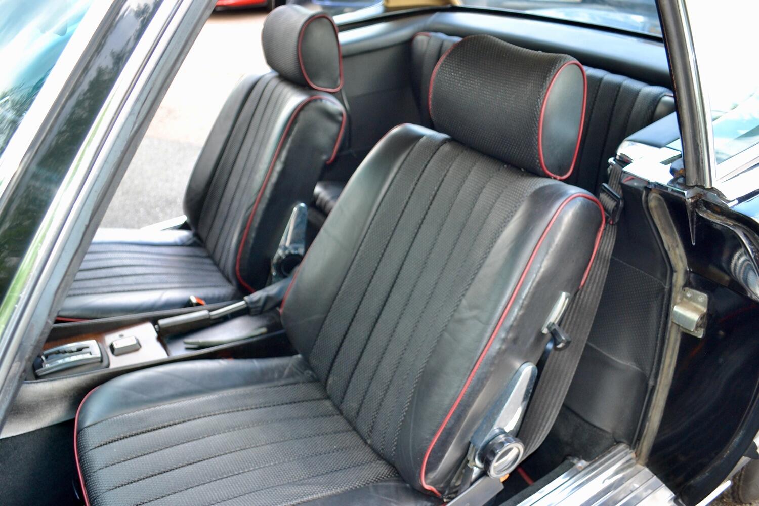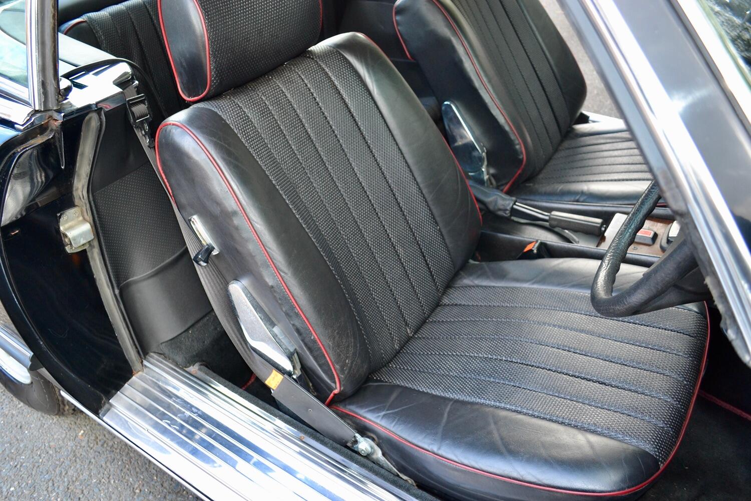 The exterior colour was originally Bronze it was painted black at some point in its life. The black shines nicely and the exterior looks neat. As you can see it comes with origenal Mexican alloy wheels, together with the bumpers and windows, are in neat condition, considering their age and showing low mileage. This also applies to the underside of this SL in very good condition . The black upholstery still looks good, together with the carpets, the dashboard and the entire instrumentation. This Mercedes is also equipped with hard and soft top, soft top showing signs of wear.