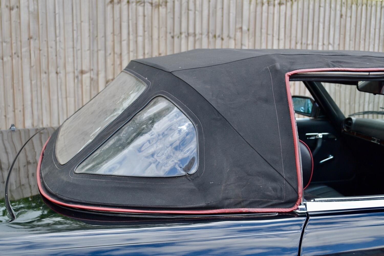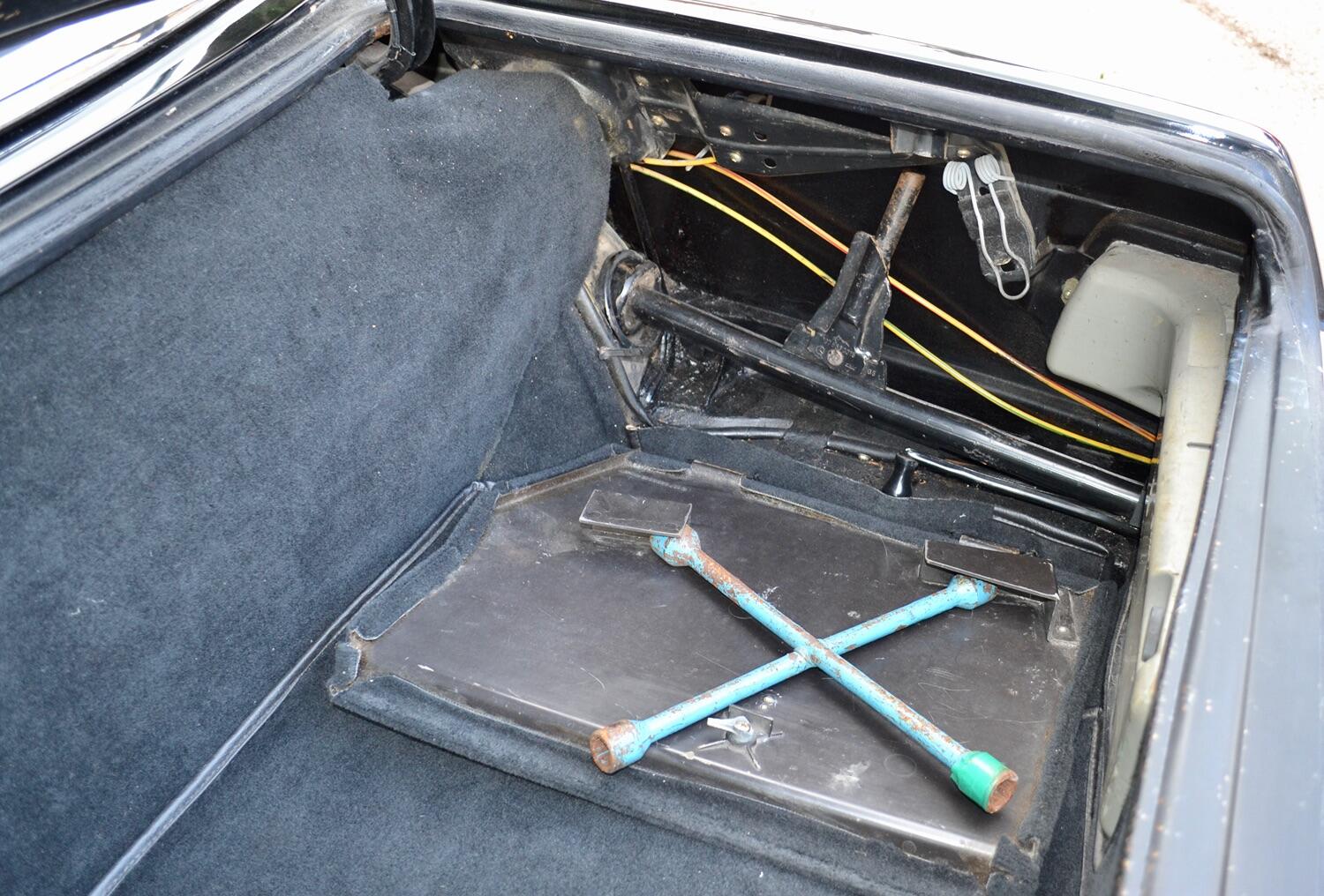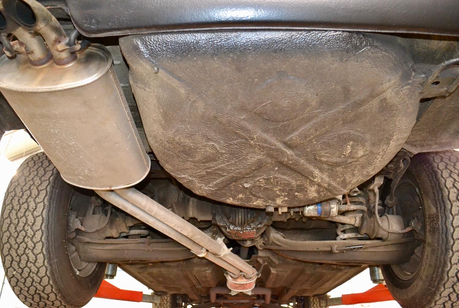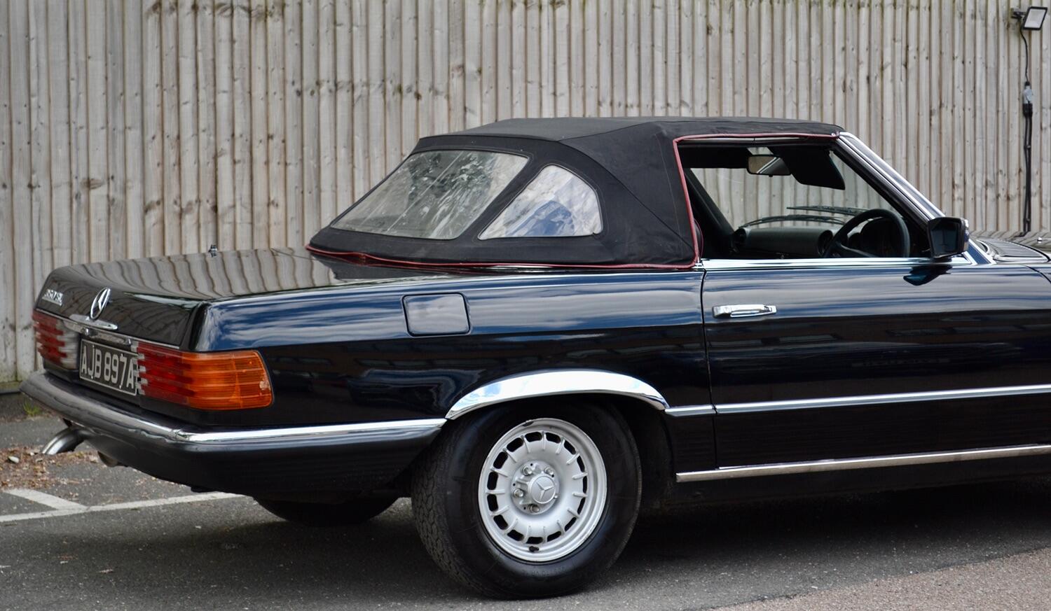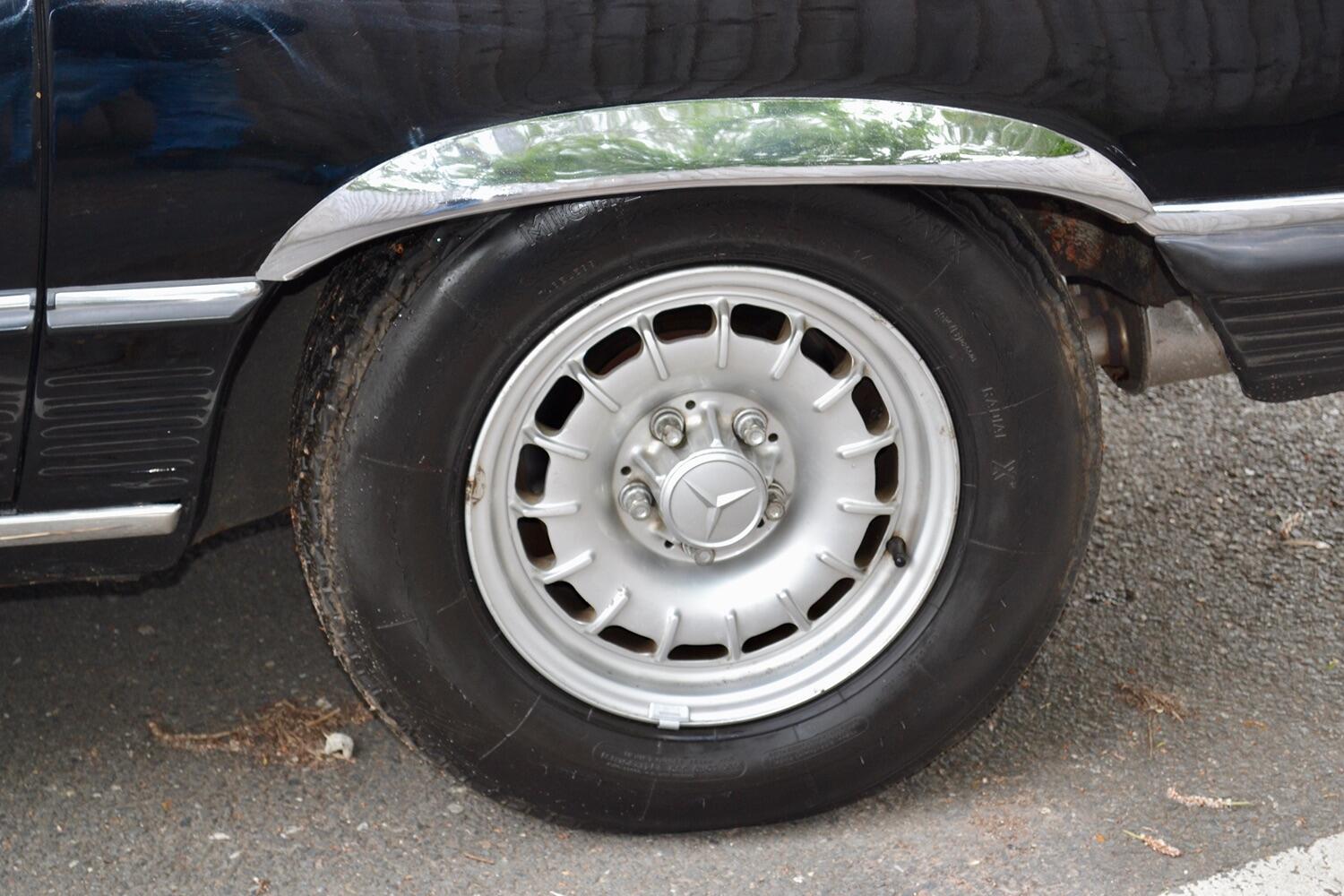 The exterior colour was originally Bronze it was painted black at some point in its life. The black shines nicely and the exterior looks neat. As you can see it comes with origenal Mexican alloy wheels, together with the bumpers and windows, are in neat condition, considering their age and showing low mileage. This also applies to the underside of this SL in very good condition . The black upholstery still looks good, together with the carpets, the dashboard and the entire instrumentation. This Mercedes is also equipped with hard and soft top, soft top showing signs of wear.